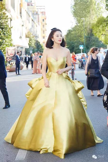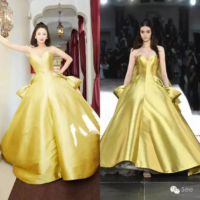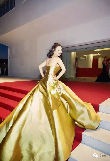 她这次的战袍是Alexis Mabille 2016秋冬高级定制金色抹胸晚礼服。