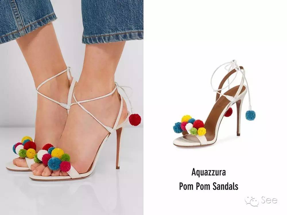Aquazzura有好几双,鞋架上彩色的Pompom Sandals。