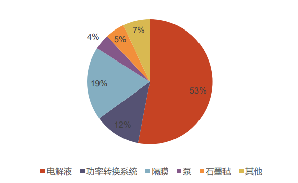 电解液是液流电池的核心材料,也是整个化学体系中存储能量的介质。在全钒液流电池中,电解液成本占据了储能电池成本的一半以上。