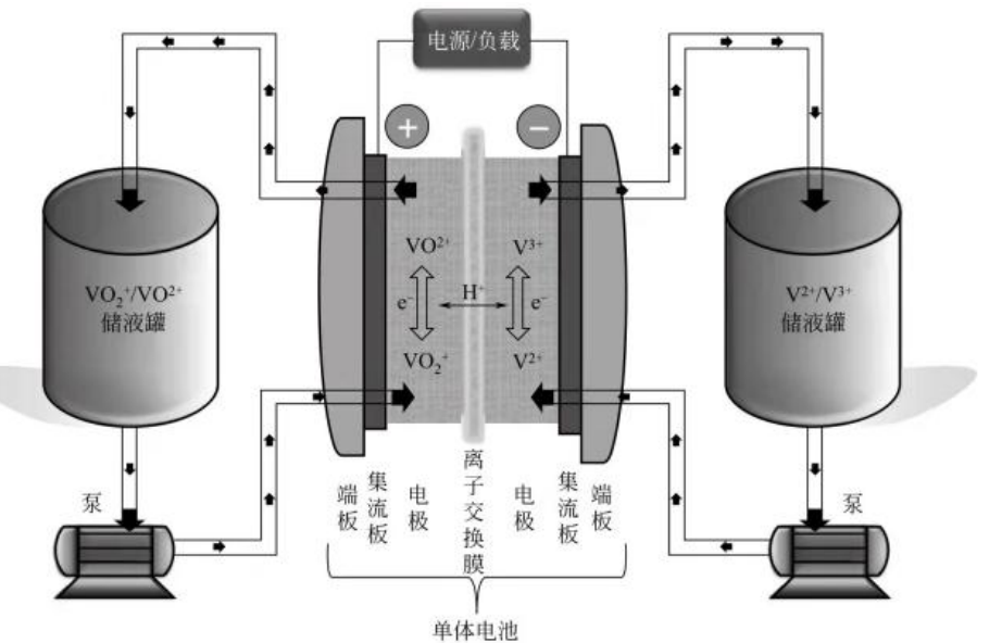 目前,主要推进的液流电池为全钒液流电池,其原理是通过两个不同化合价的、被隔膜隔开的钒离子之间交换电子来实现电能与化学能的相互转化,以实现充电、放电的过程。