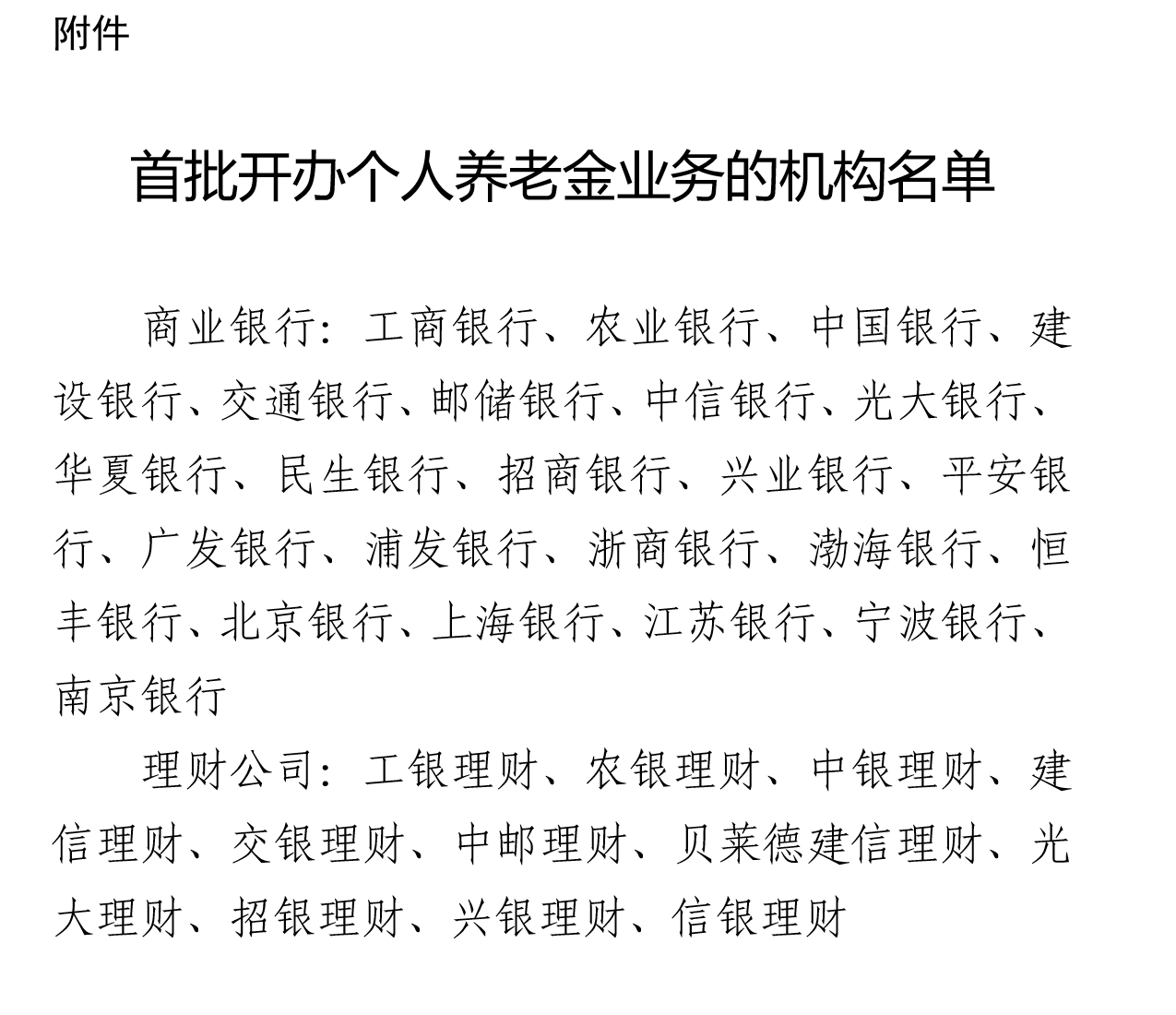 《暂行办法》确定,截至2022年三季度末,一级资本净额在1000亿元以上、具有跨区域服务能力、主要审慎监管指标符合监管规定的全国性商业银行和具有较强跨区域服务能力的城市商业银行,以及截至2022年三季度末,已纳入养老理财产品试点范围的理财公司,可以开办个人养老金业务。主要包括6家大型银行、12家股份制银行、5家城市商业银行和11家理财公司。