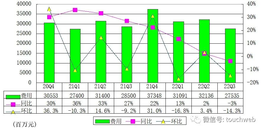 京东集团2022年第三季度的一般及行政开支为26亿元(4亿美元),2021年第三季度为31亿元。