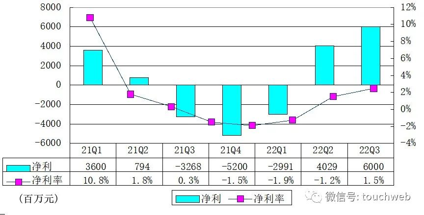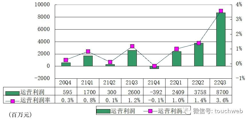 京东集团2022年第三季度经营利润为87亿元(12亿美元),上年同期为26亿元。京东集团2022年第三季度运营利润率为3.6%。