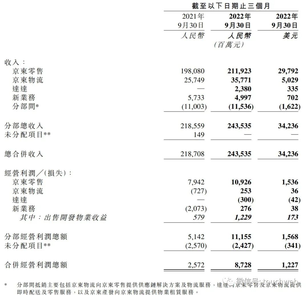 其中,京东集团2022年第三季度来自京东零售的营收为2119.23亿元(约297.92亿美元),较上年同期的1980.8亿元增长7%。