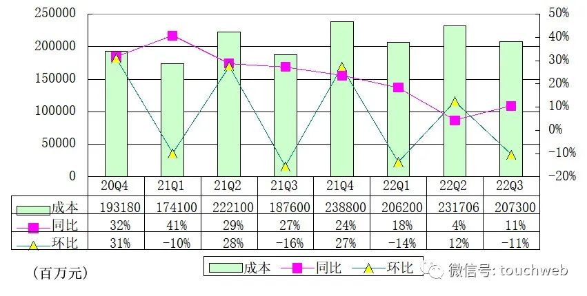 京东集团2022年第三季度营业成本为2073亿元(291亿美元),较上年同期的1876亿元增加10.5%。