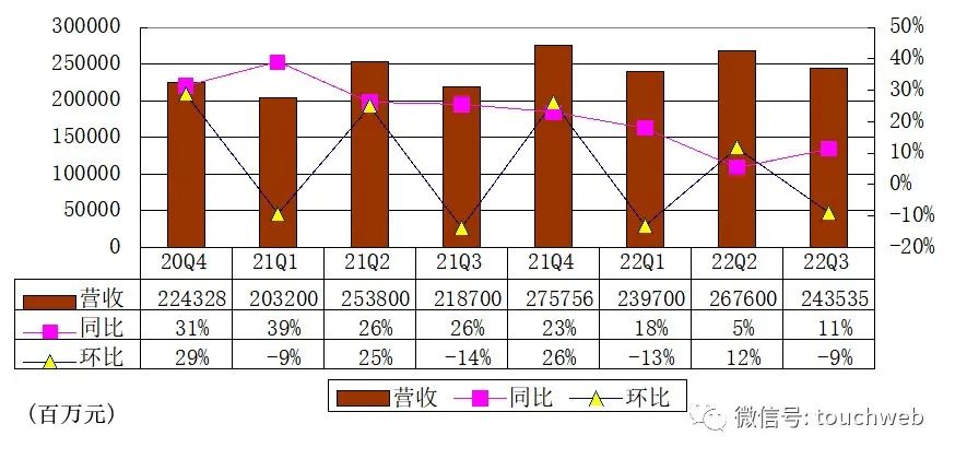 京东集团2022年第三季度营收为2435亿元(约342亿美元),较上年同期的2187亿元增长11%。