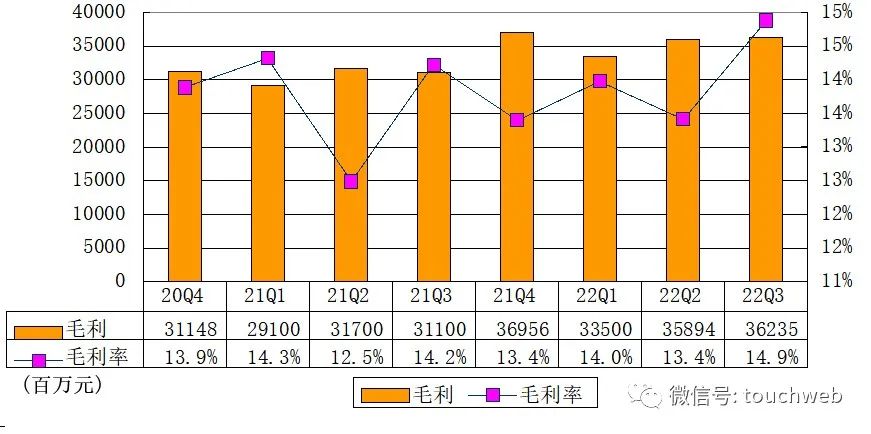 京东集团2022年第三季度毛利为362.35亿元,毛利率为14.9%。