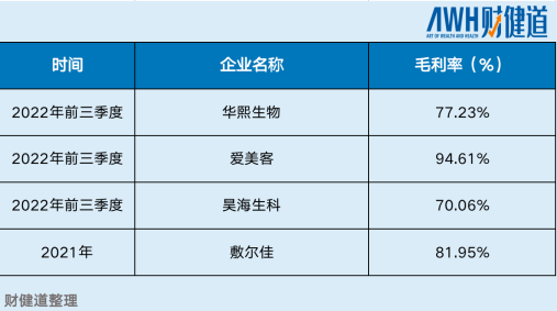 2022年前三季度,华熙生物、爱美客、昊海生科的毛利率分别为77.23%、94.61%、70.06%。敷尔佳2021年毛利率为81.95%。