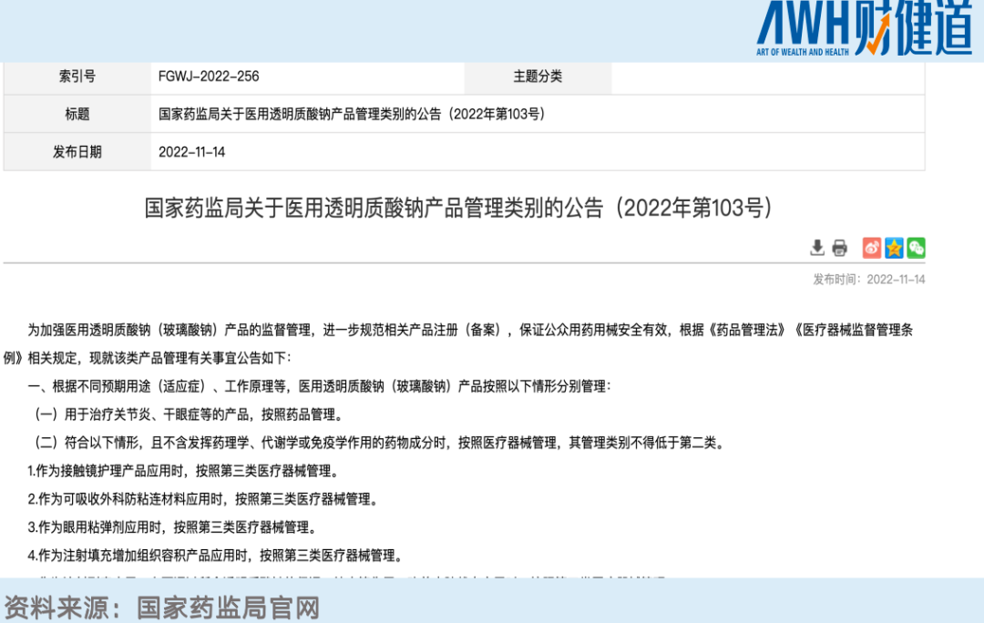2022年11月14日,国家药监局发布了关于医用透明质酸钠产品管理类别的公告(2022年第103号,下称103号公告)。其中,对医用透明质酸钠在药品、医疗器械、药械组合产品、化妆品等领域的应用,进行了更加精细化的类别监管。