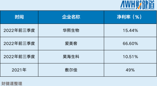 2022年前三季度,华熙生物、爱美客、昊海生科的净利率为15.44%、66.60%、10.51%。