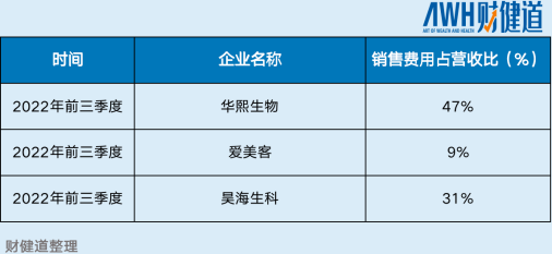 2022年前三季度,爱美客的销售费用为1.34亿元,占营收的比重为9%;华熙生物为20.30亿、昊海生科为4.98亿,二者占同期营收比分别为47%、31%。