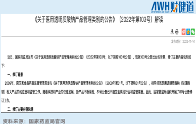 正如国家药监局发布的103号公告解读所指出:2009年,原国家食品药品监督管理局发布《关于医用透明质酸钠产品管理类别的公告》(2009年第81号,以下简称81号公告),指导规范医用透明质酸钠(玻璃酸钠)相关产品的的注册和监管工作。随着科技和产业的快速发展,新产品不断涌现,81号公告已不能完全满足行业和监管需要。
