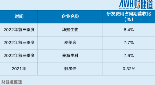 爱美客(300896.sz)方面,2022年前三季度研发费用1.15亿元,占同期营收比为7.7%;昊海生科(688366.sh)同期研发费用1.212亿元,占同期营收比为7.6%;敷尔佳2021年研发费用为524.29万元,同期营收16.49亿元,研发费用占营收比仅为0.32%。