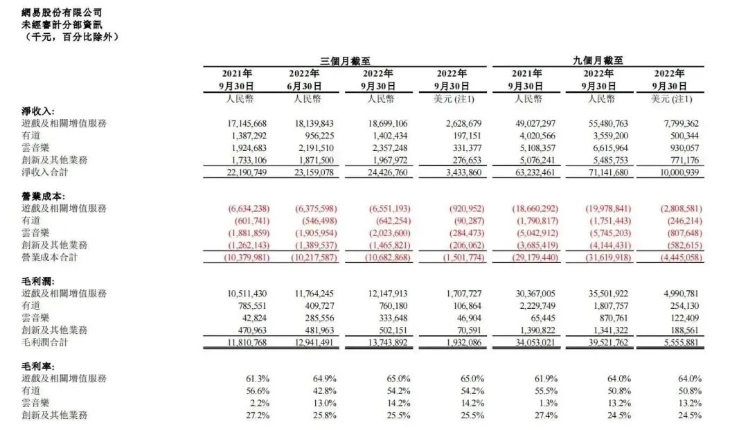 净收入244亿元,同比增长10.1%。主要驱动依然来自游戏,三季度,网易游戏及相关增值服务收入为187亿元,同比增长9.1%,占总收入的92.8%,与去年占比基本持平。