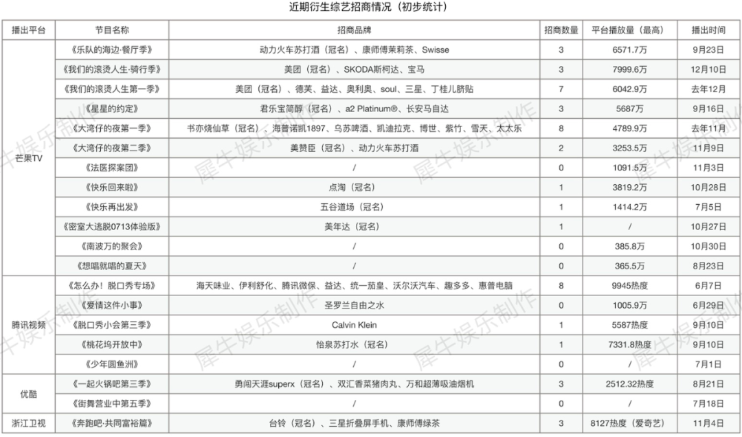 而最引起犀牛君注意的是,今年这波衍生综艺在招商上也表现抢眼。尽管招商寒冬的阴云仍笼罩市场,但据犀牛君初步统计(见下表),近期各平台开发的20档衍生综艺里有15档都至少招揽到了一个赞助商。