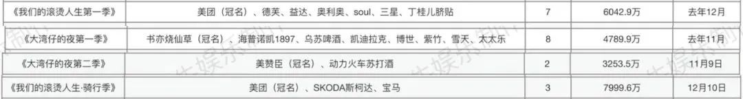 有了前季的基础打底,今年虽遇招商寒冬,《大湾仔的夜第二季》仍然拿到了美赞臣的独家冠名和动力火车苏打酒的饮品支持。《我们的滚烫人生·骑行季》则继续得到了美团大客户的信任,斯科达、宝马等座驾品牌的赞助也相当契合骑行季的主题。