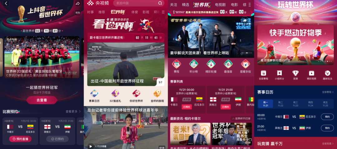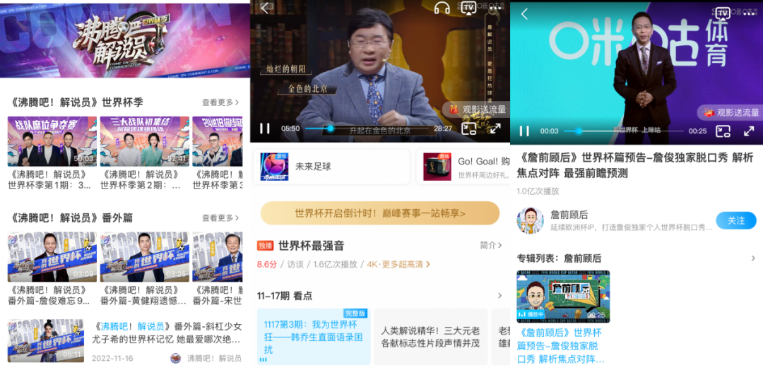 东京奥运、北京冬奥接连证明“大赛”之于文娱平台的流量加持力后(比如冬奥会王濛解说出圈助推咪咕视频下载量激增),如今各平台更为积极地对卡塔尔世界杯进行内容和营销维度的排兵布阵。