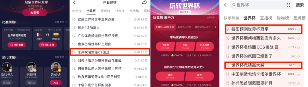 快手则拿出实打实的现金奖励促活拉新,它在首页上线的【玩竞猜赢千万】活动为竞猜加注了刺激的金豆押注玩法,#世界杯竞猜赢大奖#、#截图预测世界杯冠军# 等话题对于非球迷用户们亦有极强的吸引力。