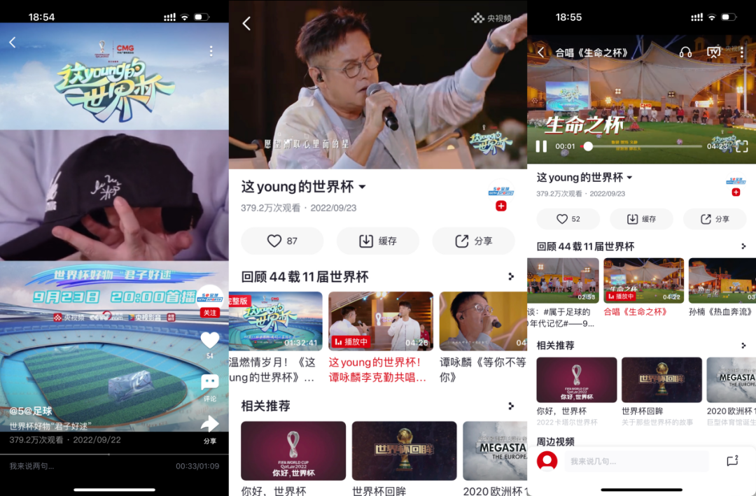 早在9月23日,央视频就携手总台解说天团以及谭咏麟、李克勤等明星大咖制作了预热综艺《这young的世界杯》,节目里众明星回顾44载11届世界杯记忆并动情献唱之余,还顺便带货了米卢签名帽、梅西签名球衣等“世界杯好物”。