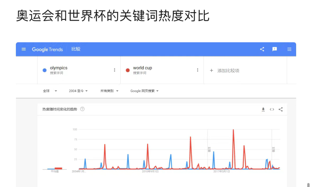 一个很少被提及的事实是,近几届世界杯网络声量的峰值其实是奥运会的两倍以上(参照下面的谷歌关键词热度趋势表),所以今年花费巨额版权费拿到转播权的抖音、央视、咪咕都卯足了劲来提前预热世界杯。