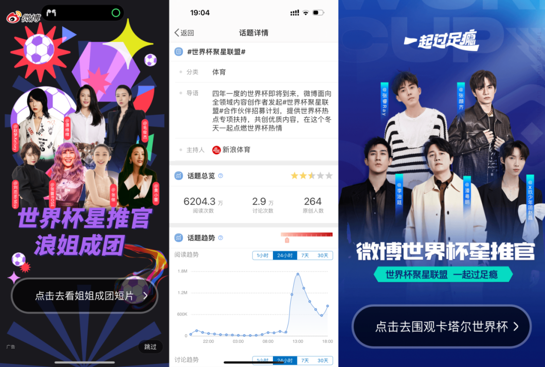 微博今年还特意策划了“世界杯聚星联盟合作计划”,邀到刘语熙、董路等8名解说大咖组成「微博足球天团」,请到“浪姐”张蔷、谭维维和人气男星刘耕宏、潘粤明等组成「世界杯星推官」,他们的官博为世界杯话题的出圈助燃了好几把火。
