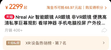 剁主发现,在Nreal京东旗舰店中,Nreal Air商品链接下的评论数仅为1000+,其天猫旗舰店中单品月销也仅为400+。值得注意的是,在双十一购物节中,Nreal Air直降200元,最低价2099元。即便如此,其线上销量整体也并未有明显涨幅。