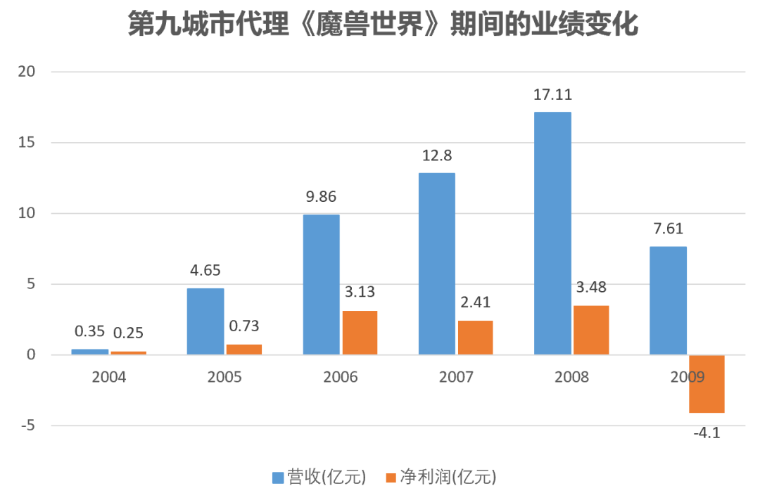 举一个直观的例子,在网易之前,与暴雪合作的中国代理商为第九城市(下称“九城”),双方合作起于2004年。回看九城的财报数据,2005年国服《魔兽世界》正式运行后,九城的年营收从2004年的3470万元飙涨至4.65亿元,相对应的净利润也翻了近3倍,达到7250万元。到了2008年,九城的年营收已经达到17亿以上。