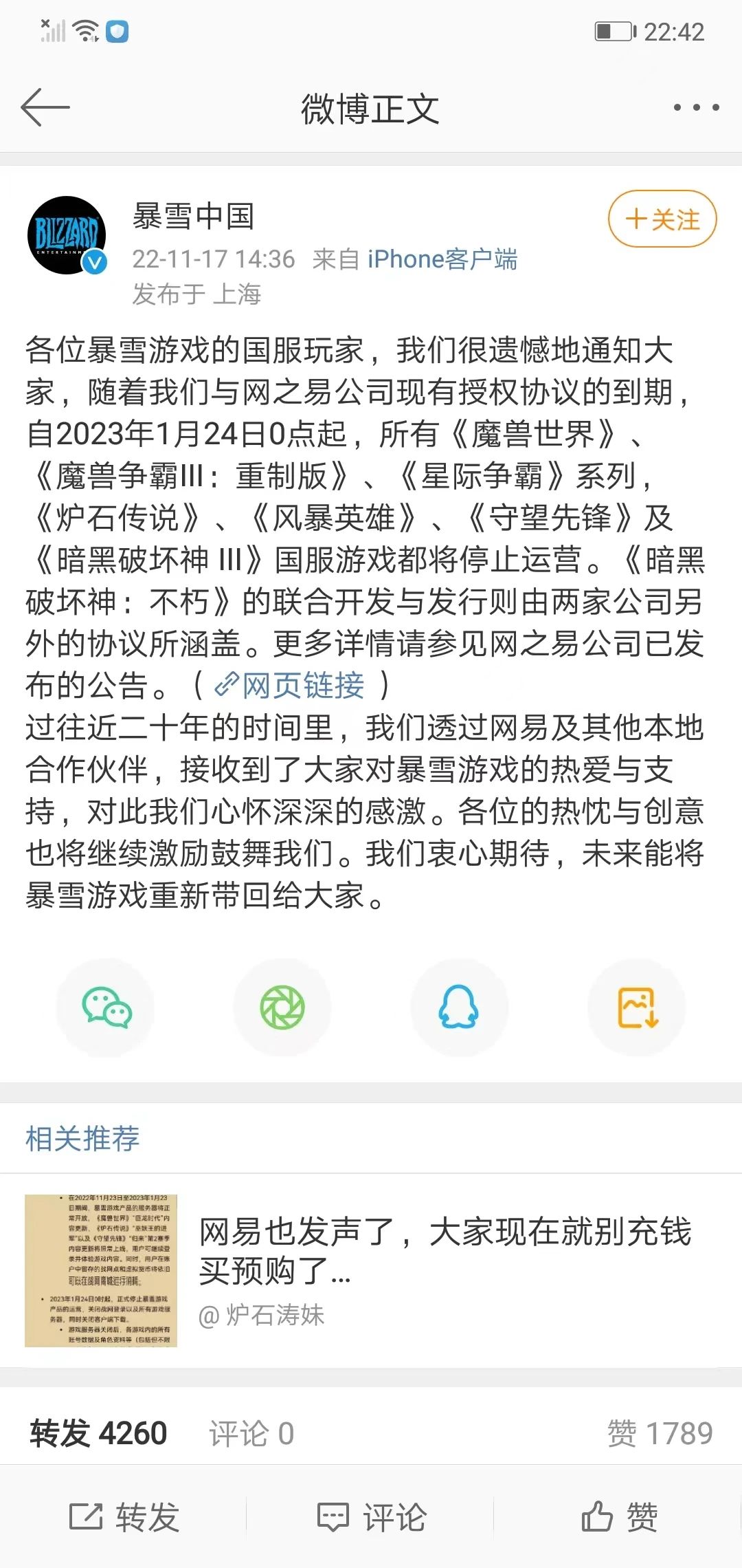 11月17日,暴雪娱乐发布公开声明称:“由于同网易的现有授权协议将在2023年1月23日到期,将暂停在中国大陆的大部分暴雪游戏服务,包括《魔兽世界》《炉石传说》《守望先锋》《星际争霸》《魔兽争霸III:重置版》《暗黑破坏神III》和《风暴英雄》。”不过,声明中特别提到,由于《暗黑破坏神:不朽》的共同开发和发行规则涉及两家公司另外的单独协议,暂不受影响。