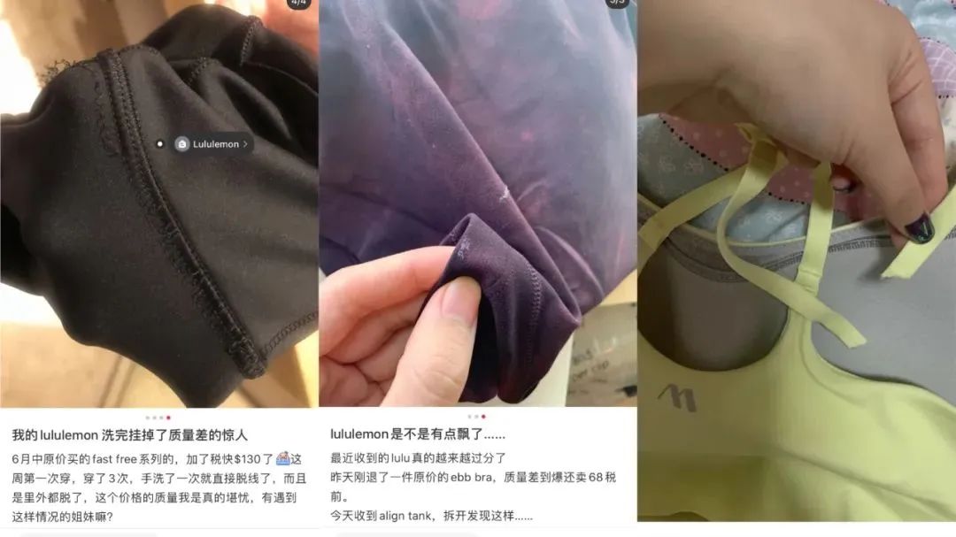 只不过,营销攻势始终并非长久之计,无论是lululemon还是国内的女性运动服饰品牌,已经有越来越多的消费者开始质疑其“不值这个价”。锌刻度在众多社交平台发现,不少消费者指出lululemon容易脱线、起球和变松等问题,并表示“不会再回购”。