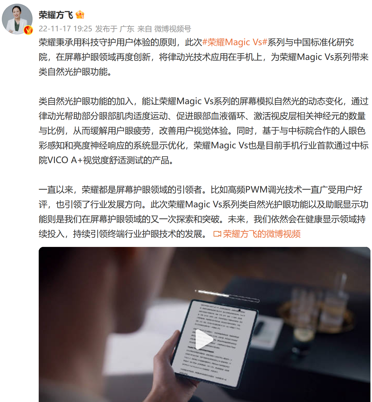 拥有轻薄长续航的特性之后,用户必然更愿意把荣耀Magic Vs作为日常主力机使用,所以“健康显示技术” 也不可忽视。