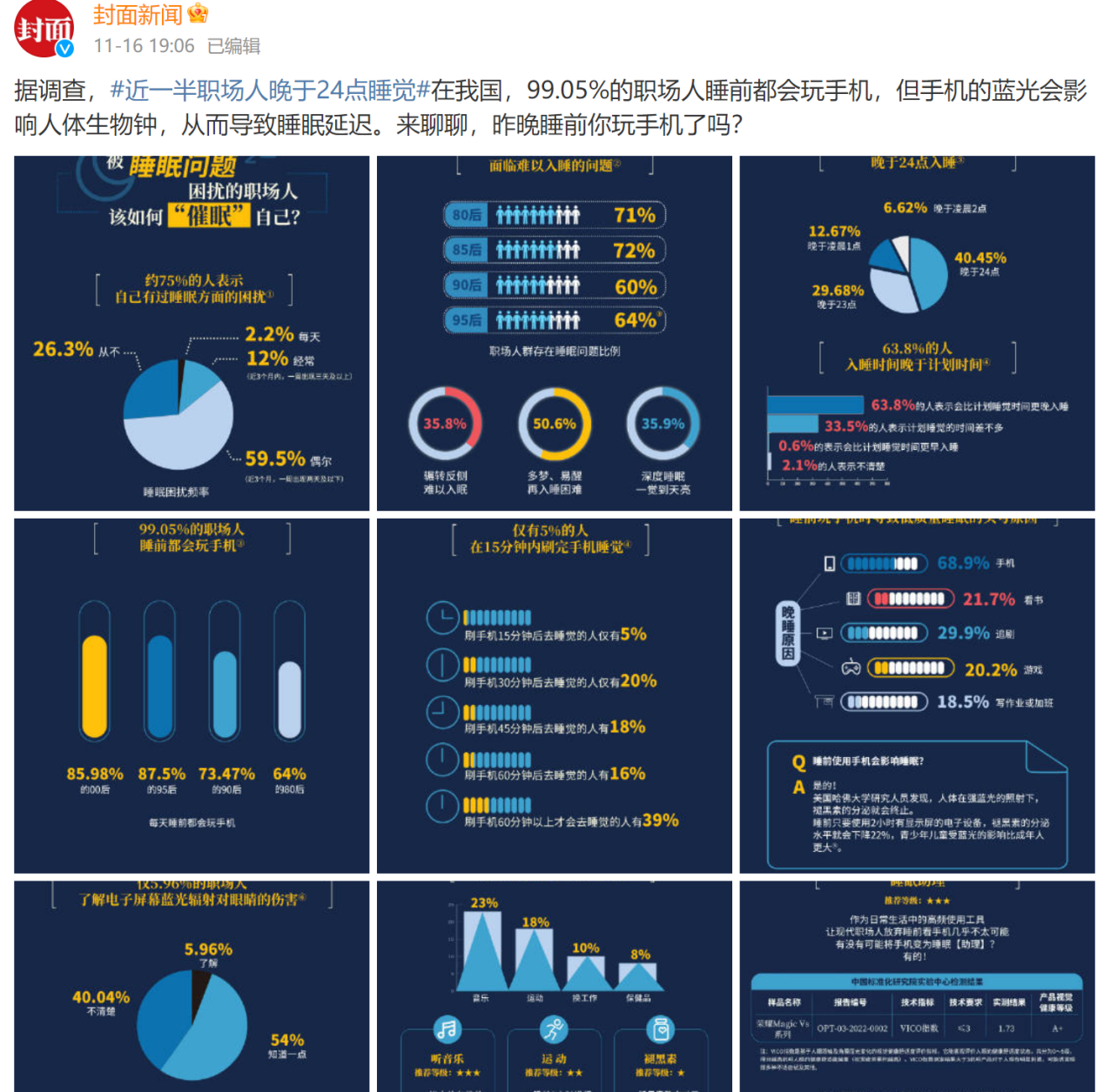 有调查数据称,我国网民平均每周上网时长约28.5小时,权威媒体《健康时报》新一轮调查数据也说到,职场人的睡眠健康指数低与玩手机是息息相关,其中99.05%的职场人睡前都会玩手机,还有近一半职场人晚于24点入睡,电子屏幕对于用眼以及睡眠的影响问题必须引起我们的重视。