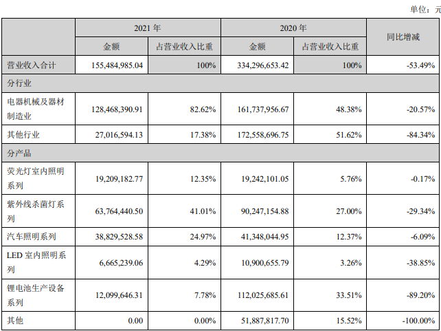 上市公司方面,2021年年报显示,*ST雪莱主要业务为紫外线杀菌灯、LED照明、汽车照明、锂电池生产设备。紫外线杀菌灯系列产品为公司的主要收入来源,约占当期总营收的41%;其次为汽车照明系列,营收占比为28%;锂电池生产设备系列产品营收占比为7.78%。