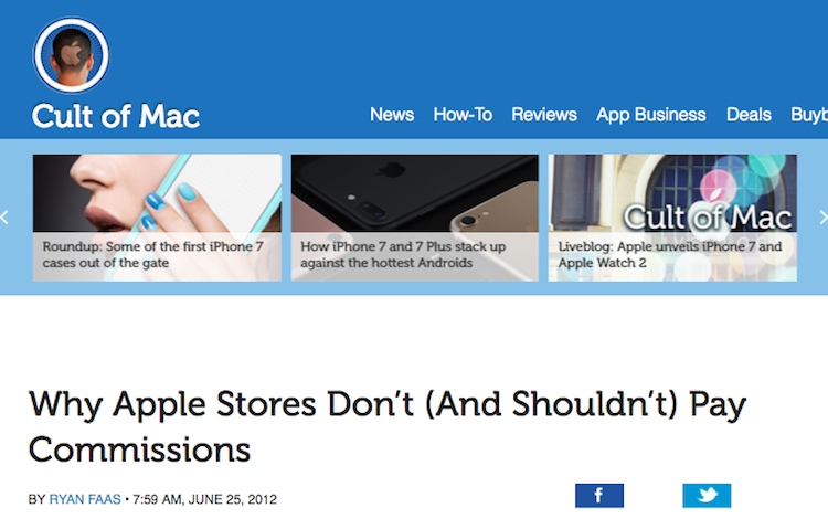 在Apple Store开业之前,苹果就决定不给零售店员工提佣金。据《纽约时报》报道,其中的理由是,苹果认为这种奖金促进销售的制度会从根本上破坏公司的主要目标,那就是帮助顾客找到合适的产品而非最贵的产品,并帮助他们与苹果的品牌建立长期的情感联系。佣金制的另外一个缺陷,是加剧同事间的竞争,破坏团结合作氛围。