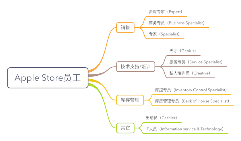 苹果零售店提供三类职位,销售、支持和管理。但是销售团队的员工不叫销售,而叫“专家”(Specialist)或“资深专家”(Expert)。