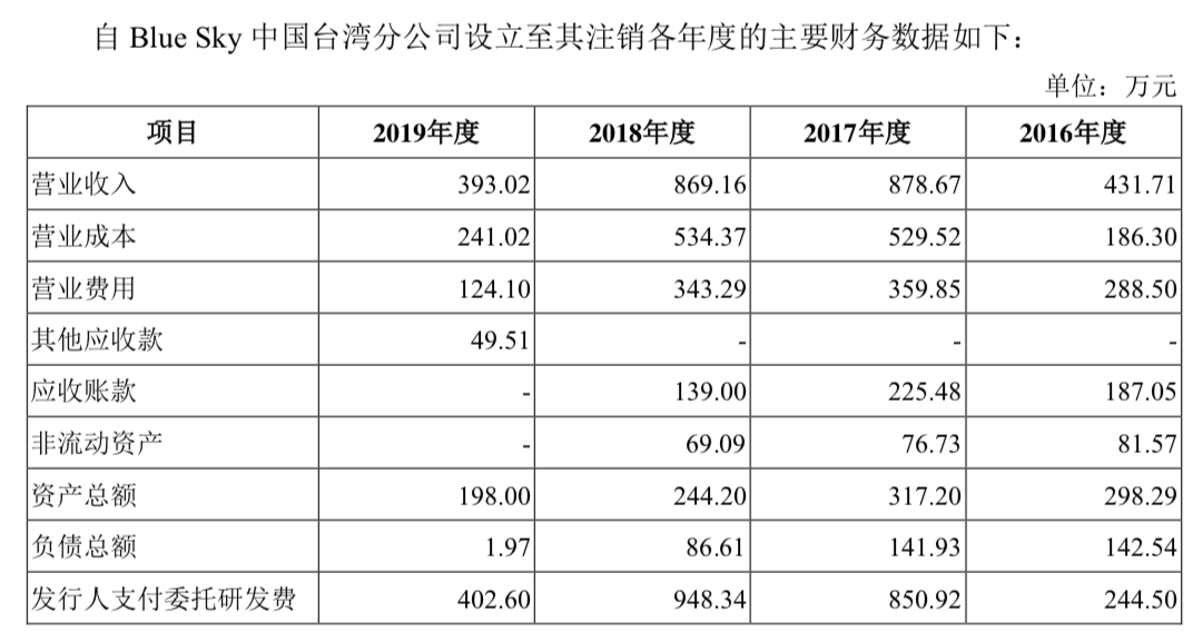 《回复函》显示,2017年-2019年新相微支付给Blue Sky中国台湾分公司的委托研发费,超过其营业收入。到《招股书》记录的2019年6月双方终止合作,2020年8月28日Blue Sky中国台湾分公司注销。