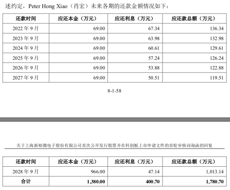 在经营新相微的过程中,肖宏也付出不少。《回复函》显示,其出资额的来源包括自有资金、卖房所得、借款等。其出售了一处位于上海的房产,所得1160万元,还向冯亚、李丁等人借款共3700万元,2020 年,肖宏委托母亲陈梦云对新相合肥借款2264.42万元,以及在2021年10月,通过上海俱驿向招商银行上海分行贷款,共1380万元。