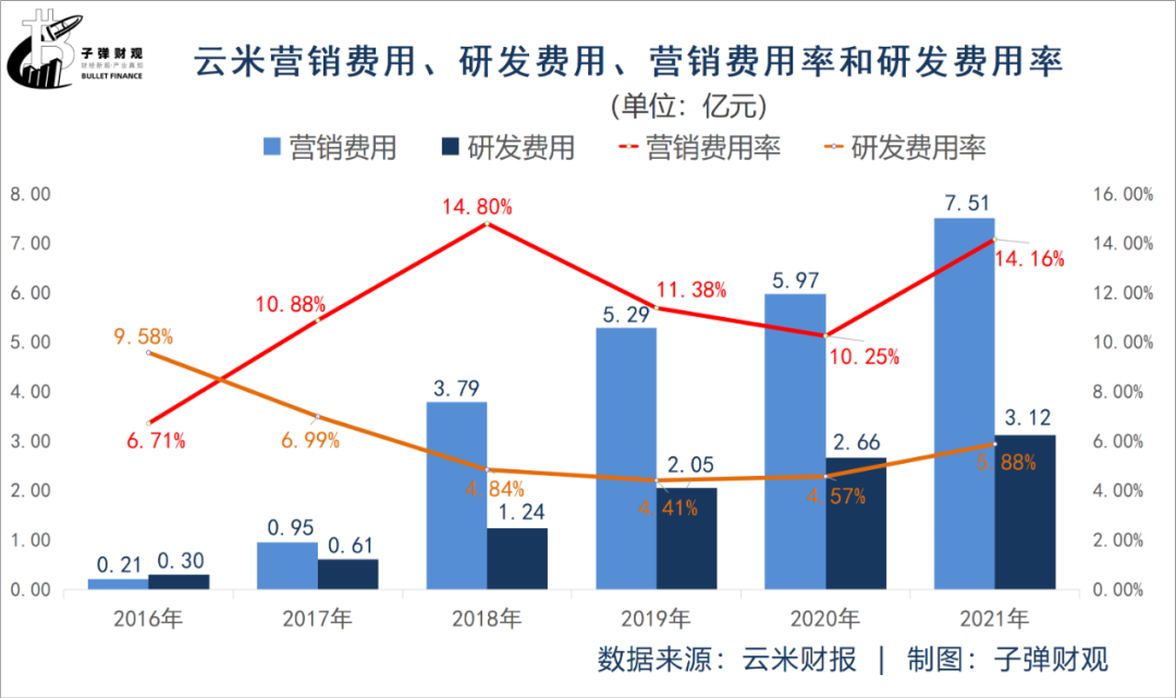 云米财报显示,2016年-2021年公司的研发费用率分别为9.58%、6.99%、4.84%、4.41%、4.57%和5.88%,呈总体下滑的趋势;营销费用率分别为6.71%、10.88%、14.80%、11.38%、10.25%和14.16%,呈现出总体上涨的势头。