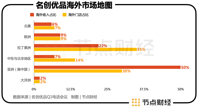 亚洲(除中国):占海外门店的50%,占海外收入的30%;