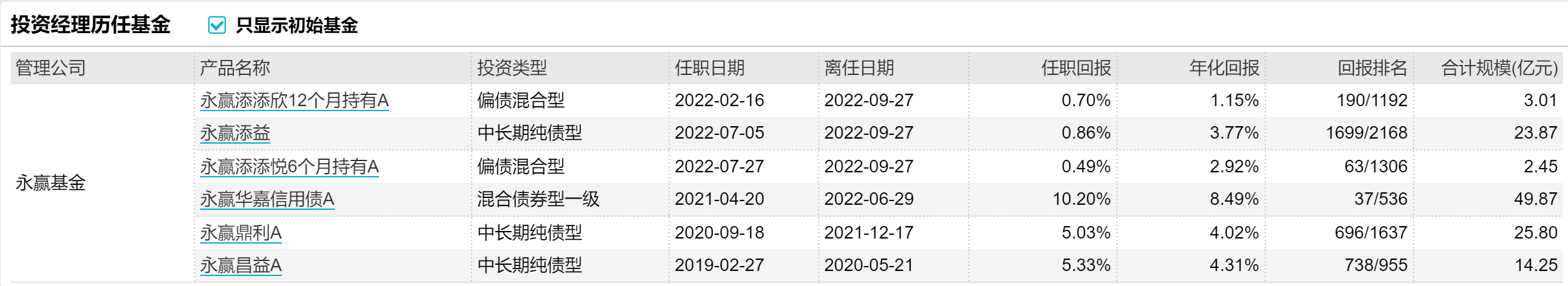 Wind资料显示,徐翔在永赢基金曾担任永赢添添欣12个月持有、永赢添益、永赢添添悦6个月持有、永赢华嘉信用债、永赢鼎利、永赢昌益等6只债基的基金经理,其中3只为今年刚刚加入,最高年化回报为8.49%。