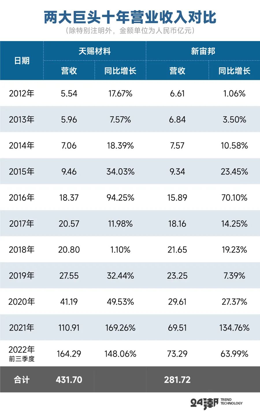 另据24潮统计,在2012年~2022年前三季度期间天赐材料营收合计为431.7亿元,是后者的1.53倍。