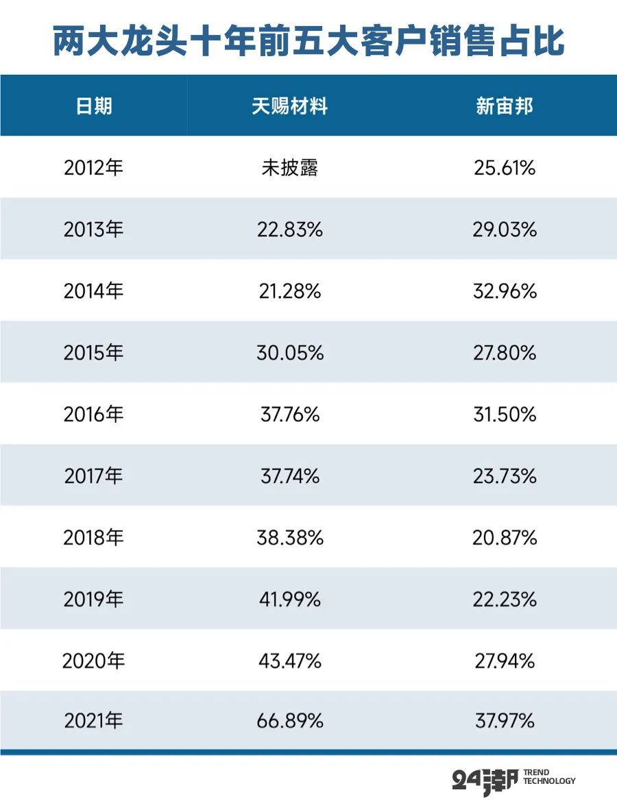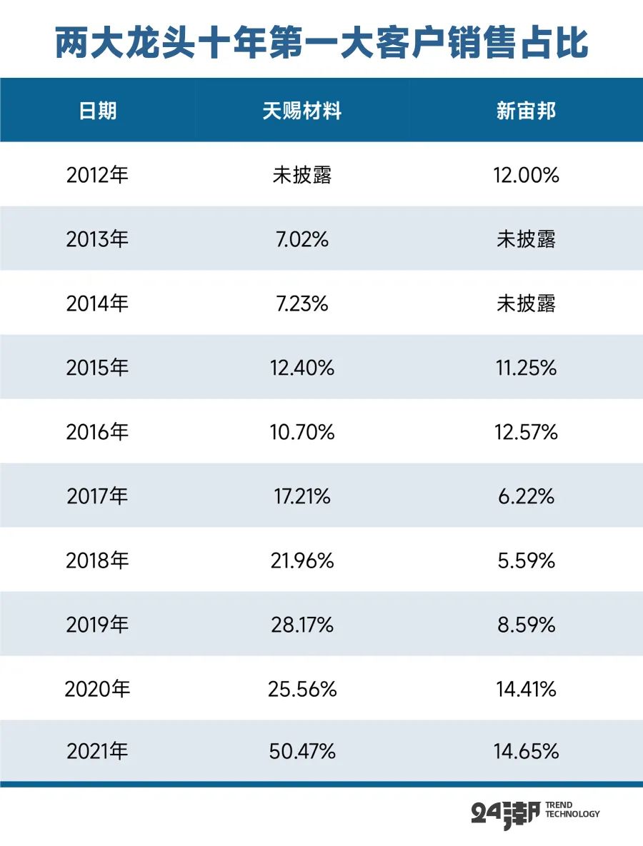 从对第一客户的销售数据变化看,天赐材料对大客户依赖的风险还在加速聚集。如下表所示,天赐材料对第一大客户的销售占比已经连续5年保持增长趋势,销售占比已经从2013年的7.02%激增至2021年的50.47%,而新宙邦2021年对第一客户的销售占比仅为14.65%。