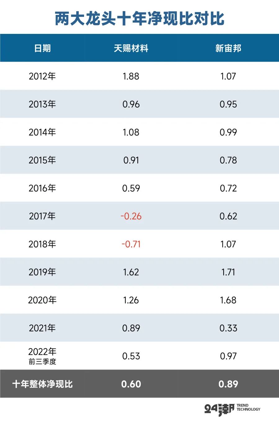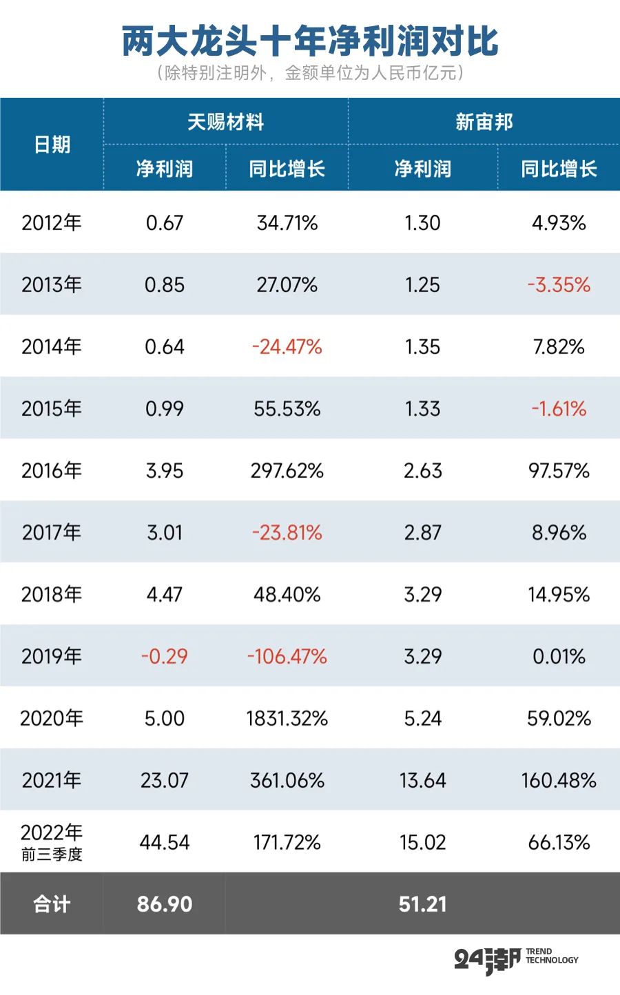 在2012年-2022年9月期间,天赐材料合计创造净利润86.9亿元,是新宙邦的1.70倍。