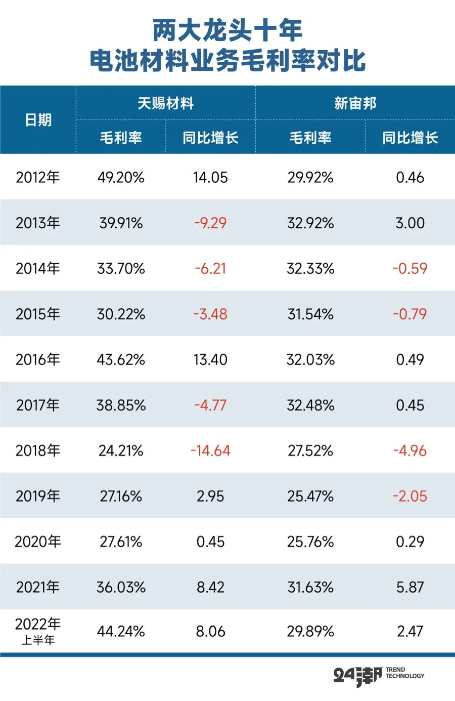 据24潮统计,在过去近11年间(2012年-2021年及2022年前三季度),天赐材料近9个年度毛利率占据优势地位,最新财报披露,2022年前三季度天赐材料综合毛利率为44.24%,这较新宙邦高出14.35个百分点。