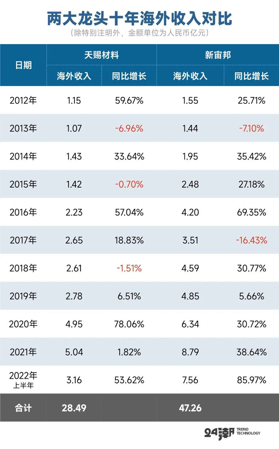如下表所示,过去十年间,新宙邦海外收入规模一直高于天赐材料,尤其是2021年以来,其无论是海外收入规模,还是海外收入增速均远超同期的天赐材料,最新数据显示,2022年上半年新宙邦海外收入为7.56亿元,是天赐材料的2.39倍。