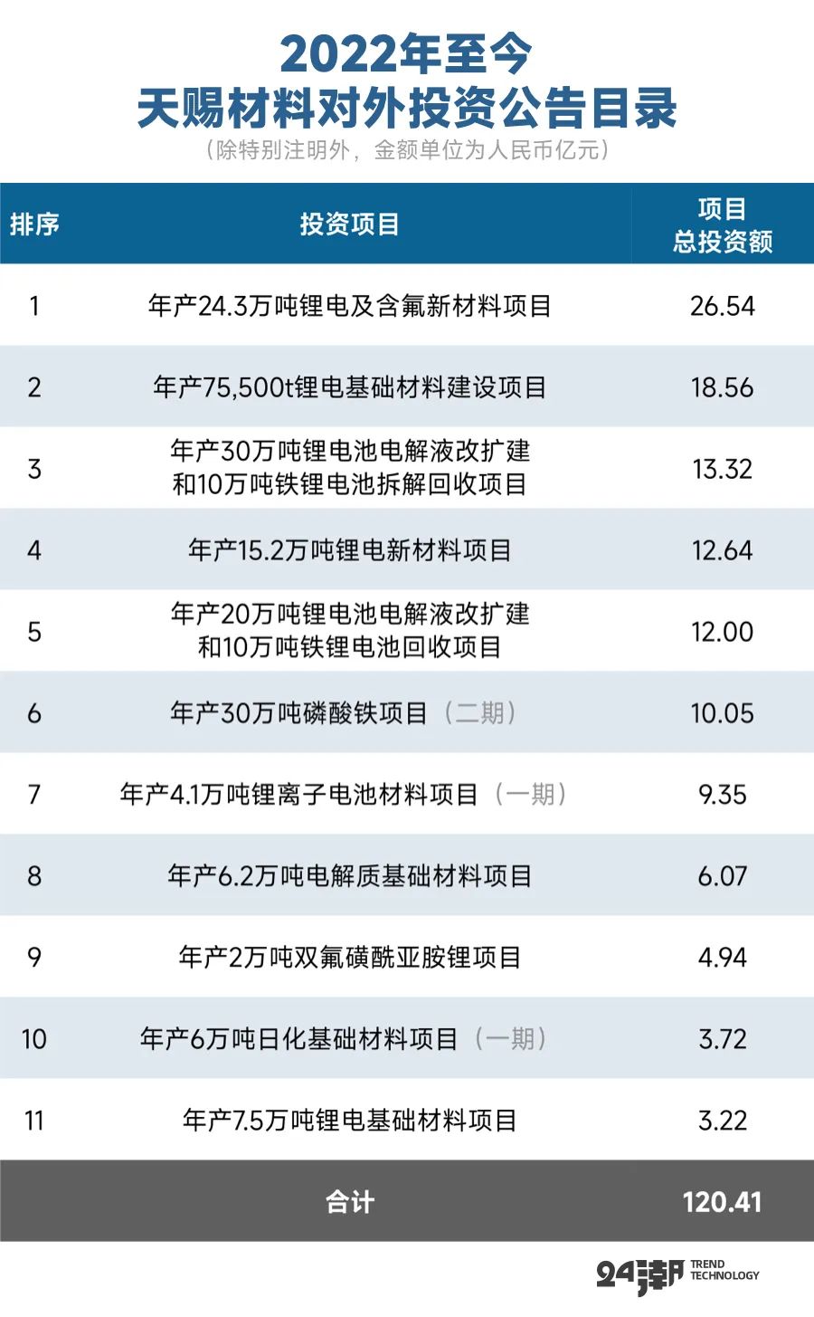 当然,从数据上看,天赐材料进击的势头更猛一些。据24潮统计,2022年至今,天赐材料约对外公布了11个投资计划,总投资额约为120.41亿元,涵盖电解液、磷酸铁、电池回收、锂电基础材料等。
