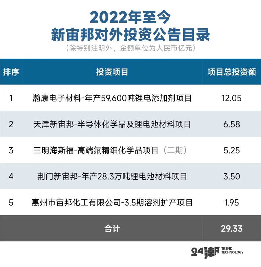 而同期新宙邦仅对外公布5个投资计划,总投资额约为29.33亿元,仅为天赐材料的24.36%。