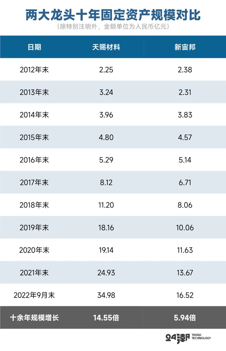 在强力投资支撑下,截止2022年9月末,天赐材料固定资产规模已增至34.98亿元,较2012年末增长近14.55倍;同期新宙邦固定资产规模为16.52亿元,较2012年末增长了5.94倍。