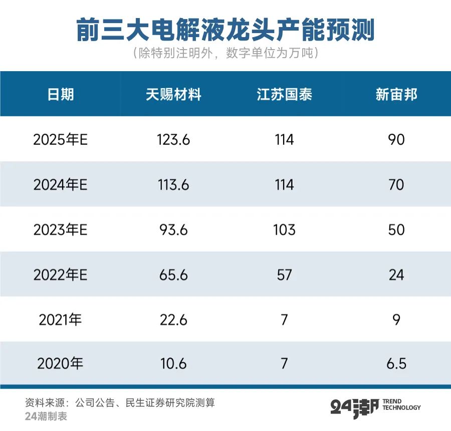 未来五年,电解液江湖可能还会有新的变化。根据民生证券分析,预计到2025年天赐材料电解液产能可能达到123.6万吨,而新宙邦约为90万吨,后者产能很可能被另一家老牌电解液江苏国泰超越。