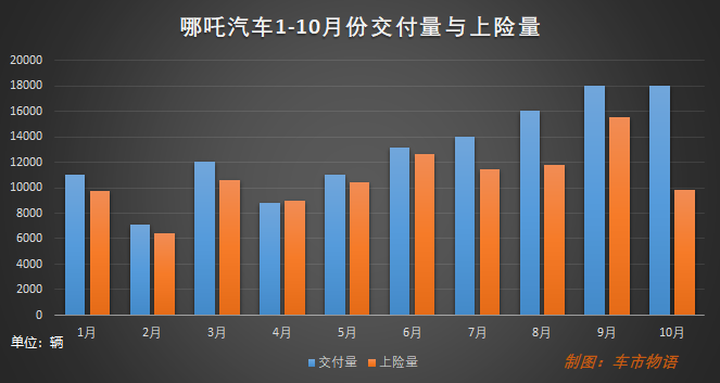 而到了10月份,新势力车企的销量排名“大洗牌”,蔚小理被埃安、哪吒、问界踩在脚下。其中,哪吒以超1.8万辆的交付量,成为新势力中的月度销冠。但10月份哪吒汽车上险量只有交付量的一半9000多辆。一位哪吒汽车的相关工作人员在与车市物语的交流中表示,10月份受疫情防控的影响,很多车到店之后,无法如期交付给用户。