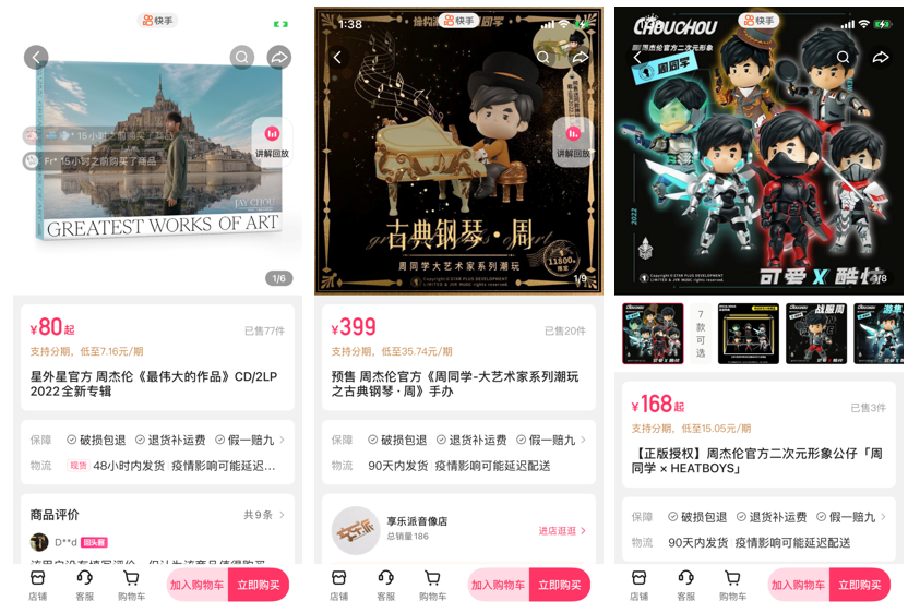 以周杰伦为例,本次直播的累计观看人数为1.1亿,和7月发布新专辑时的独家直播相比场观数据几乎持平;从预热到直播结束,“周同学”只增长400万粉丝;快手上架的周杰伦衍生周边也销售惨淡,《最伟大的作品》全新专辑、周杰伦二次元形象公仔、大艺术家系列潮玩手办等产品的总销量不过100件。